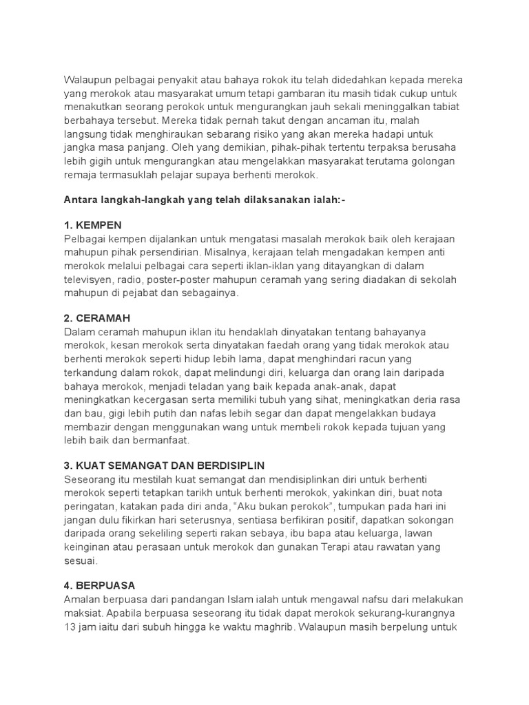 Menurut saya upaya-upaya yang dapat dilakukan untuk mencegah. Namun pendekatan ini tidak berhasil untuk semua orang dalam jangka panjang pada kenyataannya diperkirakan hanya tiga dari setiap 100 perokok yang dapat berhenti merokok secara. Ibubapa memainkan peranan yang penting dalam membentuk anak-anak sejak kecil lagi.